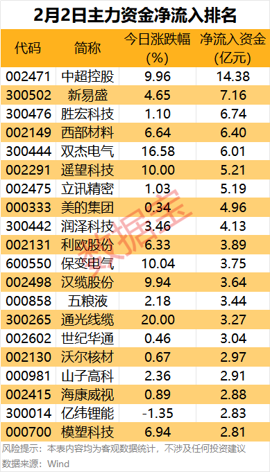 中超控股主力资金净流入14.38亿元,远超其他个股。该股近日发布业绩预告,预计2025年度归母净利润为-1800万元至-2800万元,上年同期为-2140.43万元。
