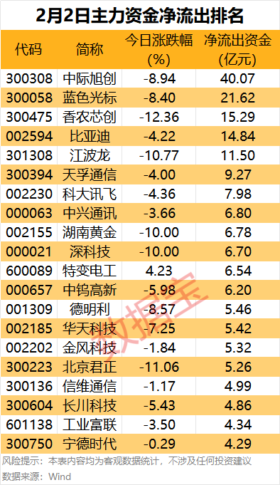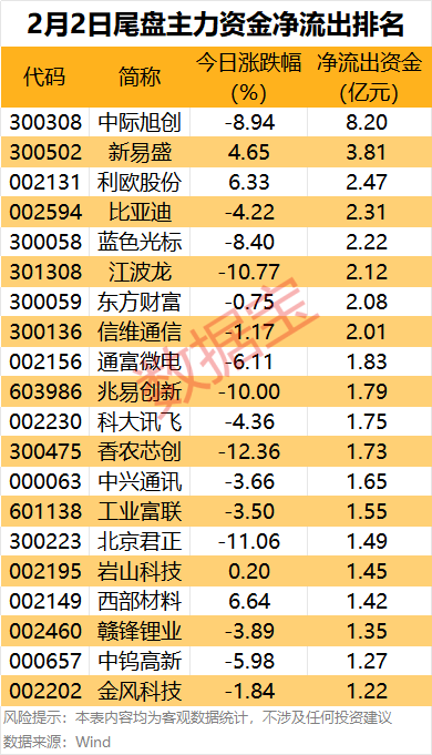 从尾盘净流出来看,数据宝统计,中际旭创、新易盛、利欧股份、比亚迪、蓝色光标、江波龙等个股尾盘主力资金净流出居前。