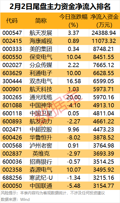 从个股来看,航天发展、海康威视尾盘主力资金净流入金额超1亿元。美的集团、保变电气、分众传媒、利通电子等个股尾盘主力资金净流入金额均超6000万元。