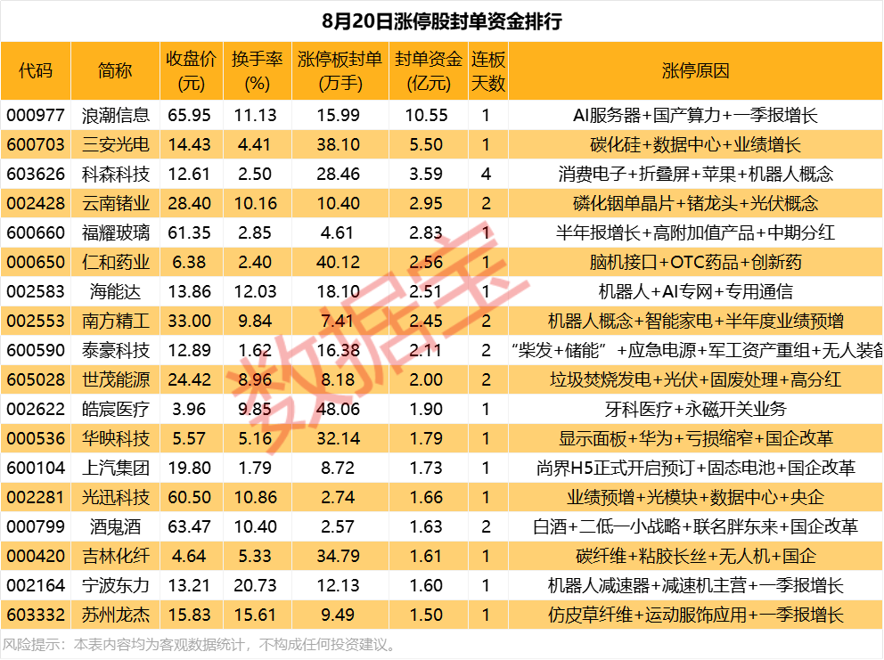 据证券时报·数据宝统计,今日(8月20日)从收盘涨停板封单量看,皓宸医疗、仁和药业排名靠前,封单量分别为48.06万手、40.12万手;三安光电、合力泰、吉林化纤、ST东时、华映科技随后,封单量均在30万手以上。