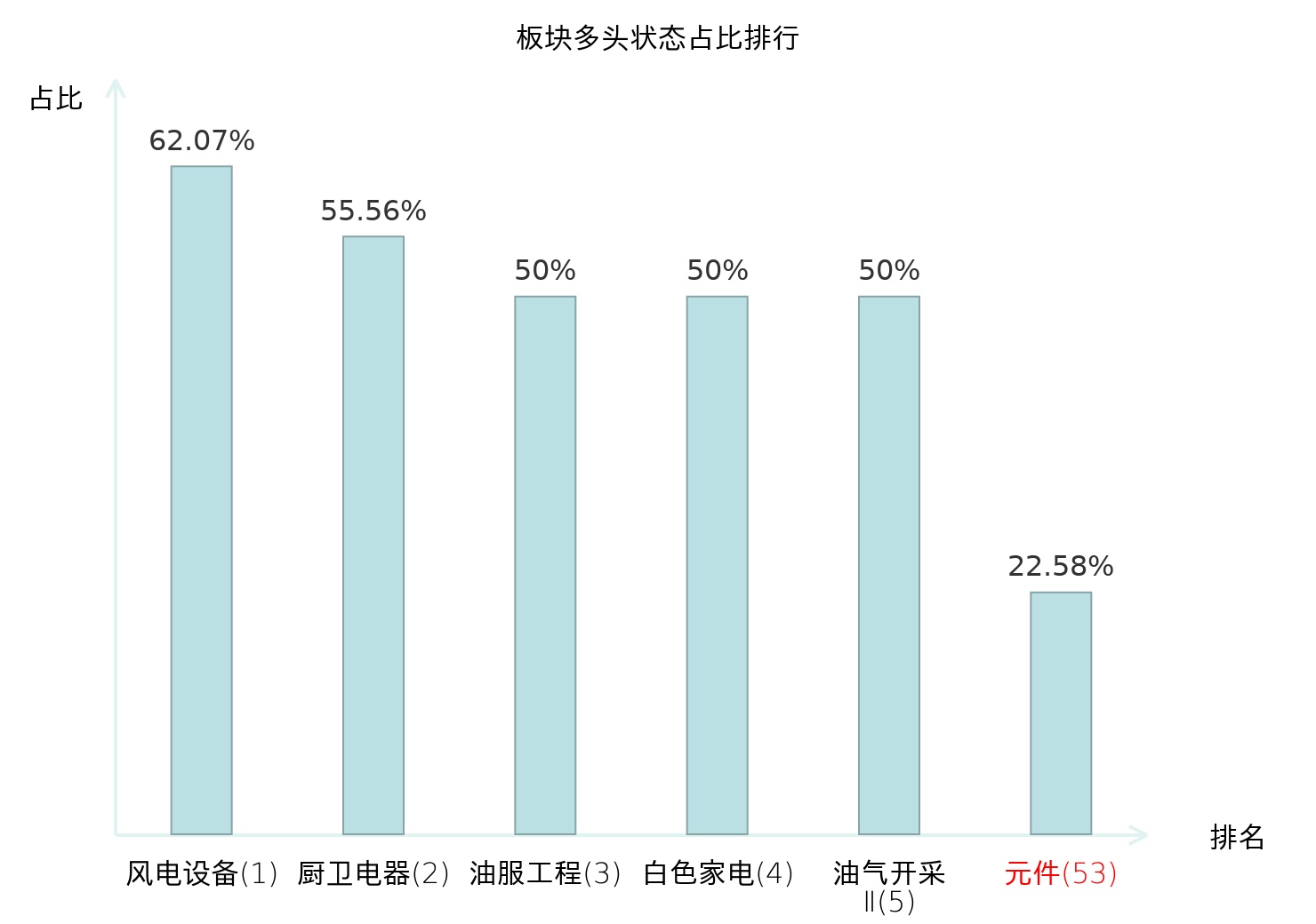 全市场所有行业板块中主力多头状态占比排名中,风电设备板块位居第一。专业连锁Ⅱ板块名次提升最快,较昨日上升65位。