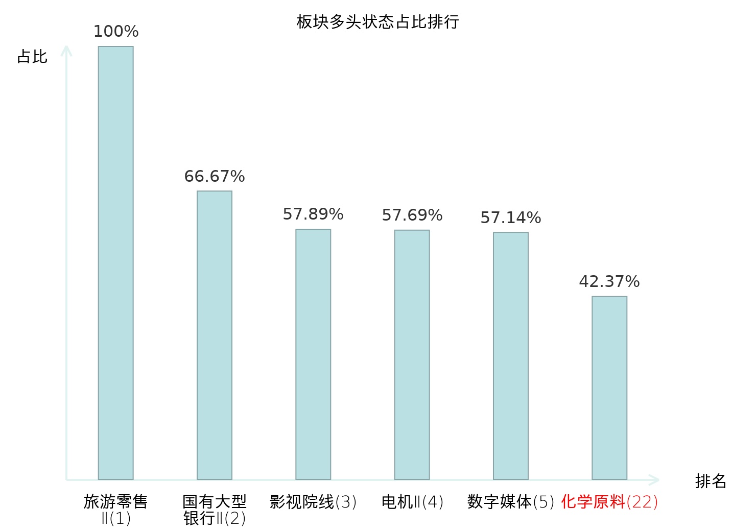 全市场所有行业板块中主力多头状态占比排名中,旅游零售Ⅱ板块位居第一。专业连锁Ⅱ板块名次提升最快,较昨日上升56位。