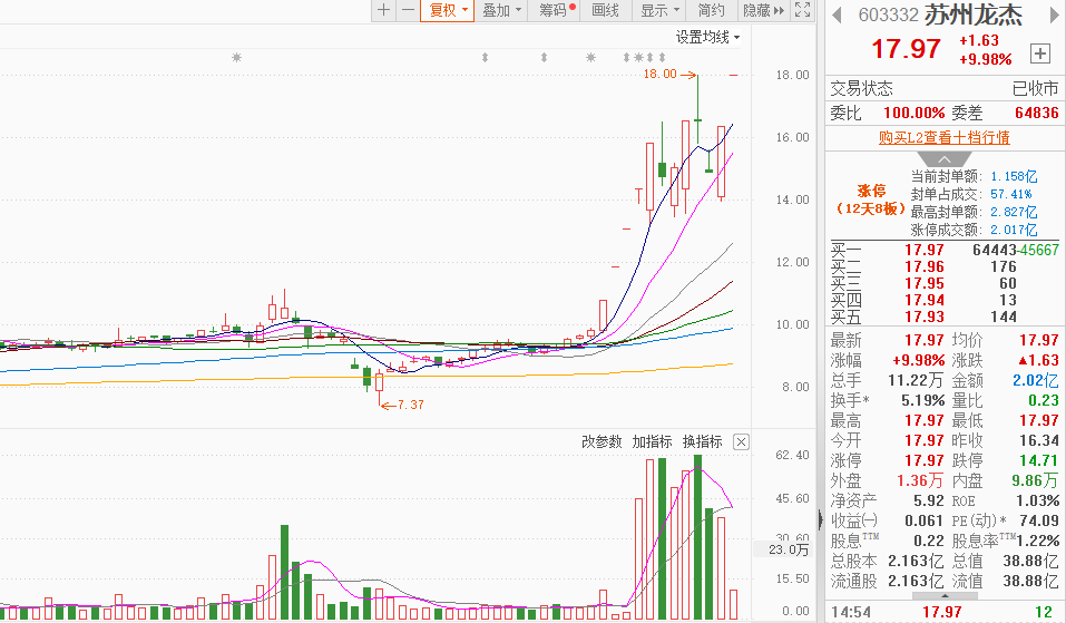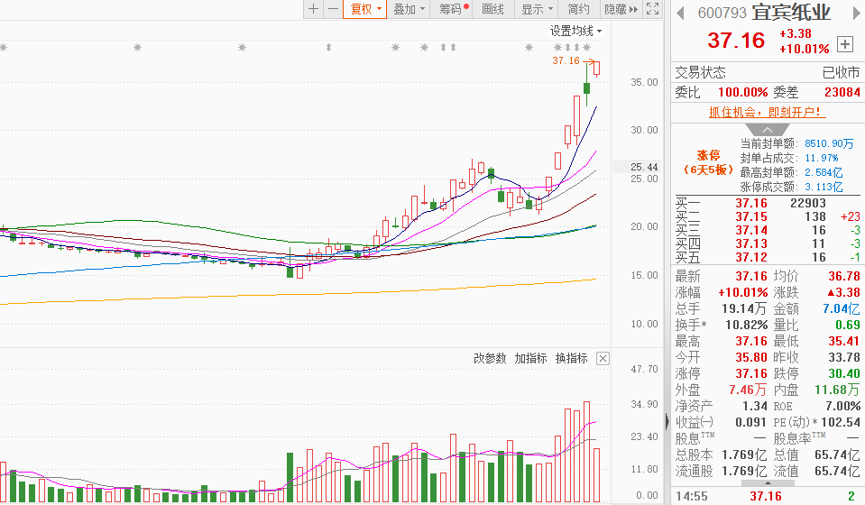 市场情绪:市场热点较为杂乱,个股涨多跌少,全市场超3700只个股上涨。今日共62股涨停,连板股总数10只,23股封板未遂,封板率为73%(不含ST股、退市股)。焦点股方面,核电板块中超控股16天10板、哈焊华通20CM2连板,化工股苏州龙杰12天8板、安纳达9天5板、汇得科技4连板,并购重组的宜宾纸业6天5板。