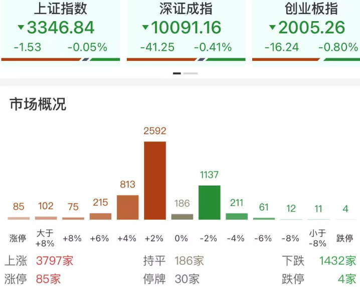 市场全天震荡调整,创业板指领跌,宁德时代跌超4%。沪深两市全天成交额1.01万亿,较上个交易日缩量1456亿。盘面上,核电股集体爆发,中核科技等近20股涨停;IP经济概念股震荡走强,京华激光等近10股涨停。下跌方面,医药股集体调整,海辰药业等多股跌超5%。截至收盘,沪指跌0.05%,深成指跌0.41%,创业板指跌0.8%。涨跌幅方面,可控核聚变、智能物流、PEEK材料、IP经济等板块涨幅居前,创新药、汽车整车、中药、维生素等板块跌幅居前。
