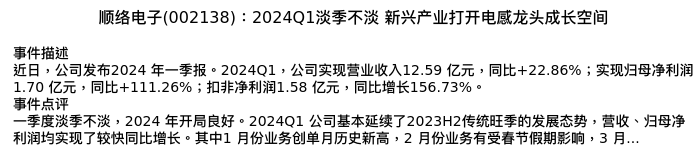 值得注意的是:2024年04月山西证券的高宇洋/傅盛盛分析师,首次发布关于顺络电子的研究报告,标题为:顺络电子(002138):2024Q1淡季不淡 新兴产业打开电感龙头成长空间。