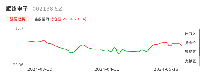 我们来看一下该股的九方特色指标强弱趋势的情况:顺络电子自04月29日从观望区上穿到持仓区。股价近期在多头区域回调整理。后续重点关注多空分界点的争夺:25.86元。如未能有效站稳则可能重新回到空头行情。