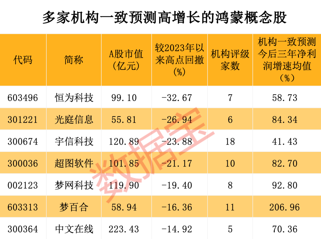 根据5家以上机构一致预测,今后三年净利润增速均有望超30%的概念股仅7只,包括梦百合、梦网科技、光庭信息、超图软件、恒为科技、宇信科技、中文在线。