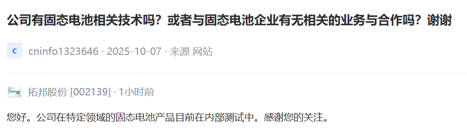 上证报中国证券网讯 拓邦股份16日在互动平台上回答投资者提问时表示,公司在特定领域的固态电池产品目前在内部测试中。