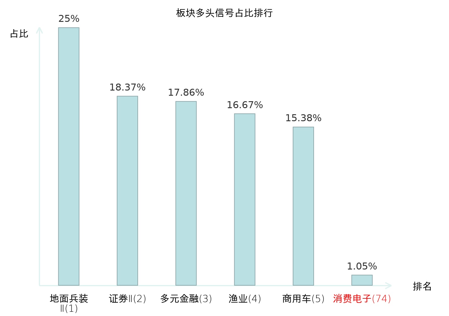 全市场所有行业板块中主力多头信号占比排名中,地面兵装Ⅱ板块位居第一。渔业板块名次提升最快,较昨日上升119位。