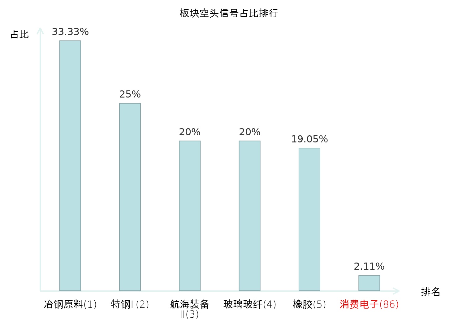 全市场所有行业板块中主力空头信号占比排名中,冶钢原料板块位居第一。军工电子Ⅱ板块名次提升最快,较昨日上升98位。