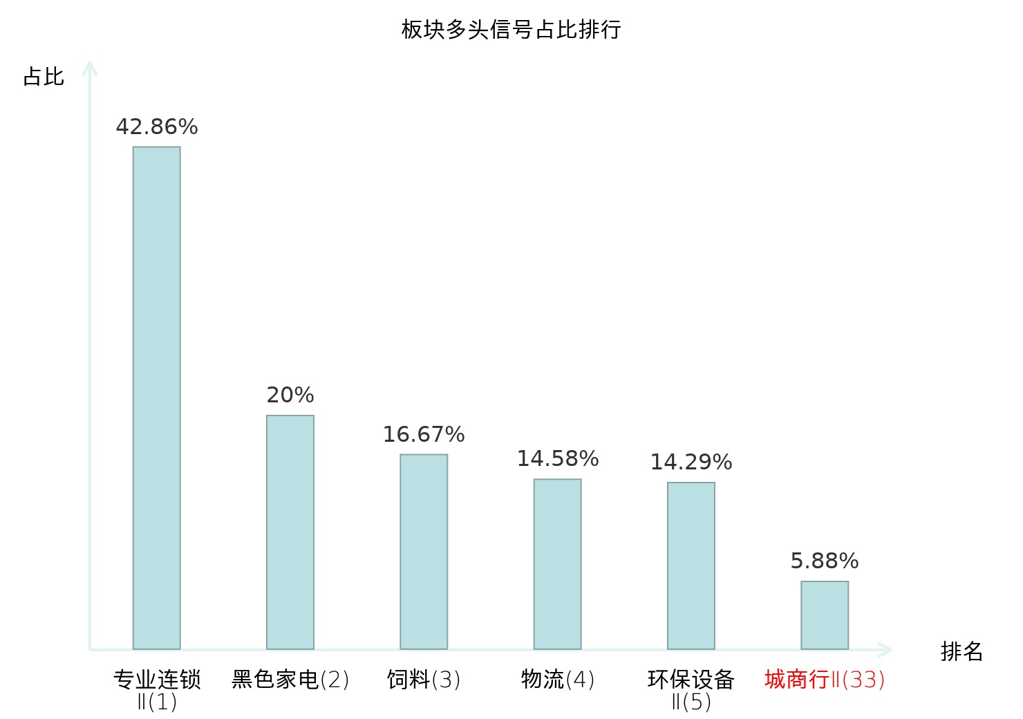 全市场所有行业板块中主力多头信号占比排名中,专业连锁Ⅱ板块位居第一。专业连锁Ⅱ板块名次提升最快,较昨日上升122位。