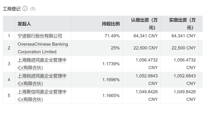 近日,公开信息显示,永赢基金新增3家有限合伙企业为股东,合计持有股权3.51%,其股权系由股东Oversea-Chinese Banking Corporation Limited(新加坡华侨银行)转让。股权变更完成后,宁波银行持股比例维持71.49%不变,仍为永赢基金第一大股东;新加坡华侨银行持股比例调整为25%,继续作为公司主要股东。