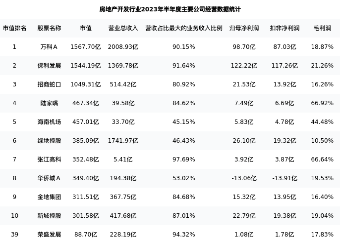 荣盛发展最新报告期数据为半年度,下表汇总了房地产开发行业内市值靠前的公司半年度主要经营数据