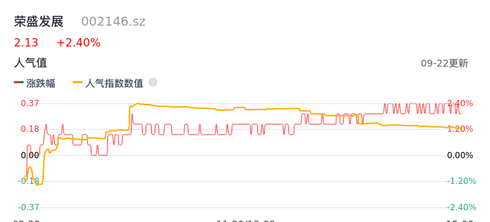 09月22日,荣盛发展收报2.13,股价涨幅2.40%,成交金额2.58亿元,换手率3.14%。