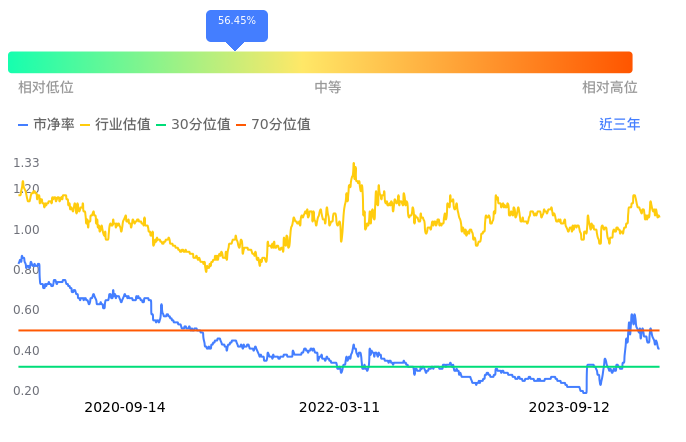 荣盛发展当前市净率PB为0.41,在所属的房地产开发中,市净率PB排4,前五名分别为ST世茂市净率0.29、金融街市净率0.36、福星股份市净率0.39、荣盛发展市净率0.41、绿地控股市净率0.42。荣盛发展当前市净率PB为0.41,超过近3年56.45%的历史数据。