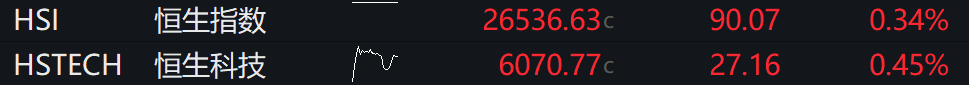 恒指高开0.34%,恒生科技指数涨0.45%。新能源车产业链续涨,宁德时代涨近3%;黄金继续新高征程,有色行业跟进涨势,山东黄金、江西铜业股份涨4%;热门次新股药捷安康高开近15%。
