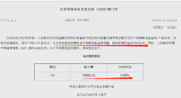 央行4月15日公告,开展中期借贷便利(MLF)操作1000亿元。此次MLF期限为1年,中标利率为2.95%,此前为3.15%,相比此前下降20BP。今日不开展逆回购操作。