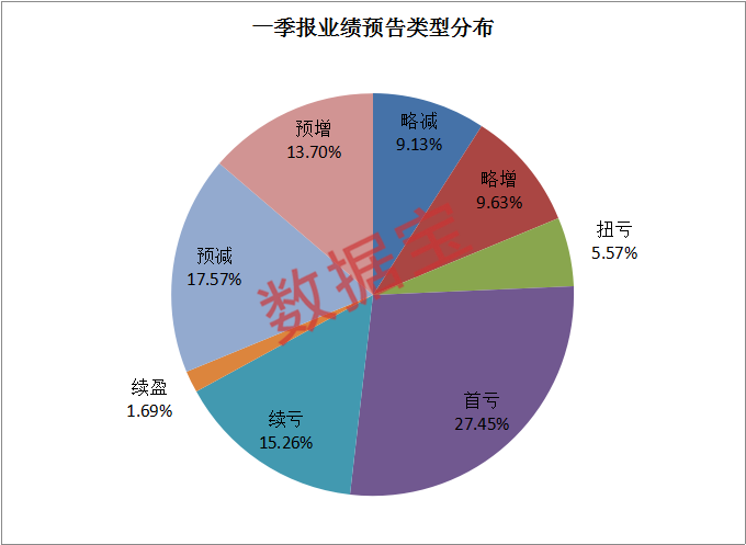 从业绩预告类型来看,两市1600份业绩预告中,489只个股一季度业绩预喜,占比仅三成。其中,业绩预增个股占比13.7%,扭亏股占比5.57%,27.45%的个股业绩首亏。