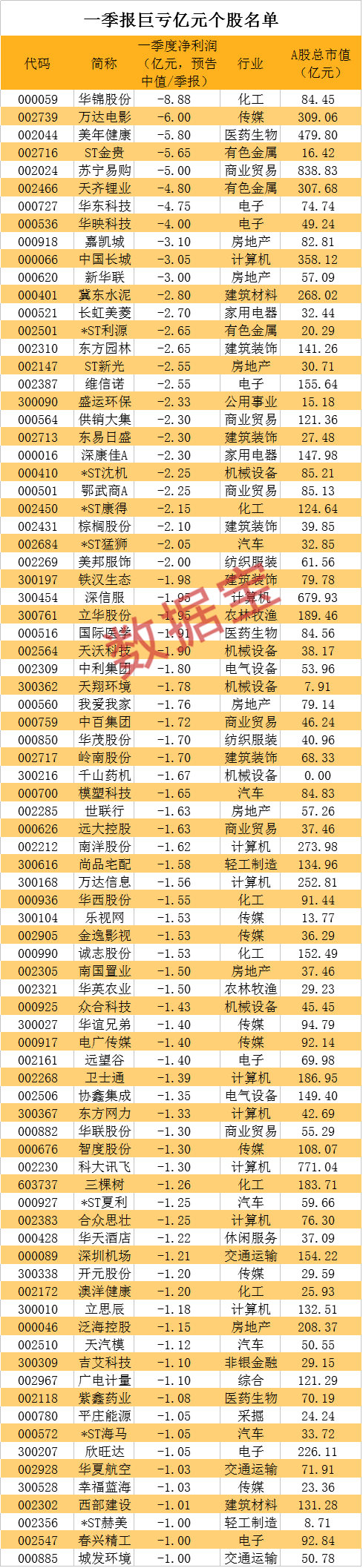 一季报业绩巨亏股名单
