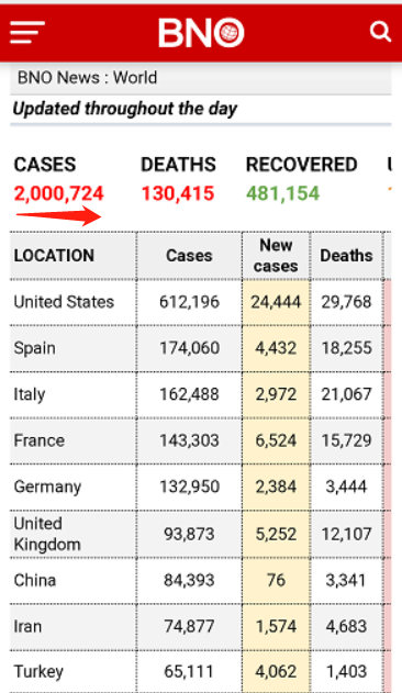 据荷兰媒体BNO News最新发布的数据显示,全球新冠肺炎确诊病例超200万例,达2000724例,死亡病例累计达130415例。约翰斯·霍普金斯大学数据显示,截至北京时间15日11时50分,美国确诊病例超过609240例,死亡逾26033例,仍为全球确诊及死亡病例最多的国家。印度卫生部披露数据显示,印度新冠肺炎确诊病例达到11439人,其中死亡病例377人,治愈出院1306人,确诊病例比前一晚公布的数字增加了624人。
