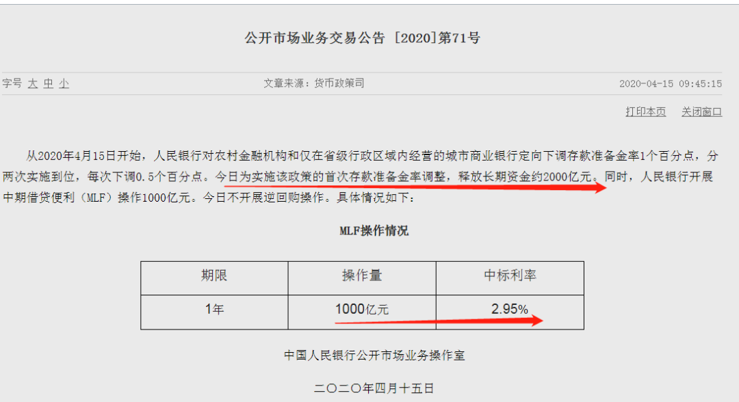 首批定向降准今日实施 MLF中标利率下调20BP