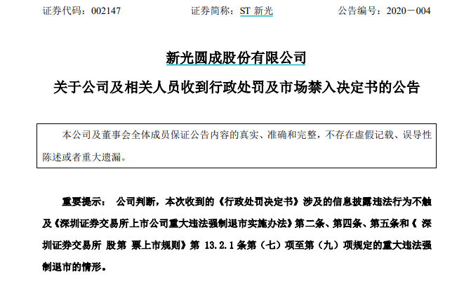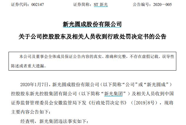 1月7日晚间,ST新光发布公告称收到安徽证监局的行政处罚决定书及市场禁入决定书。具体来看,ST新光共有以下“四宗罪”: