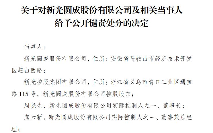 事实上,此次处罚早有端倪。在2019年4月,就在证监会立案调查不久之后,深交所即因控股股东非经营性资金占用、违规提供担保等事由,对ST新光及新光控股、周晓光、虞云新等人给出公开谴责处分。