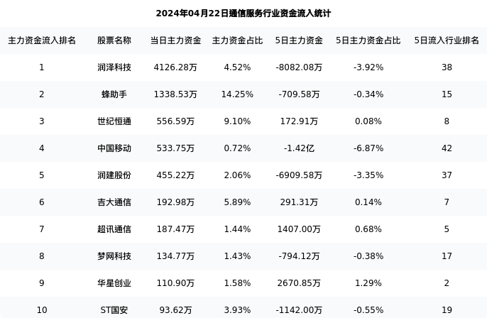 从主力资金流向来看,通信服务行业今日主力资金流入22.52亿元,在所有申万二级行业中排名:103/131。