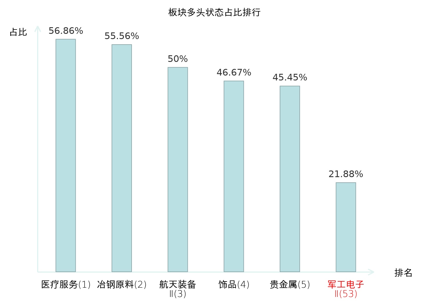 全市场所有行业板块中主力多头状态占比排名中,医疗服务板块位居第一。旅游及景区板块名次提升最快,较昨日上升61位。