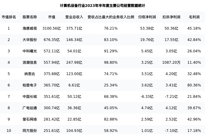 广电运通最新报告期数据为半年度,下表汇总了计算机设备行业内市值靠前的公司半年度主要经营数据