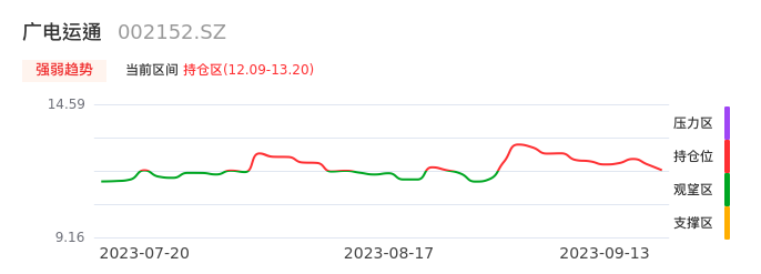 我们来看一下该股的九方特色指标强弱趋势的情况:广电运通自08月29日从观望区上穿到持仓区。股价近期在多头区域回调整理。后续重点关注多空分界点的争夺:12.09元。如未能有效站稳则可能重新回到空头行情。