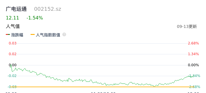 09月13日,广电运通收报12.11,股价涨幅-1.54%,成交金额2.56亿元,换手率0.85%。