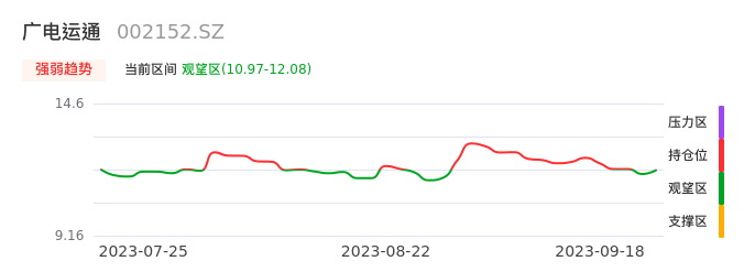我们来看一下该股的九方特色指标强弱趋势的情况:广电运通近日从持仓区下穿到观望区,股价出现持续调整。短期出现止跌态势,后续重点关注能否再次站上多空分界点:12.08元。如未能有效突破则可能进入新一轮空头行情。