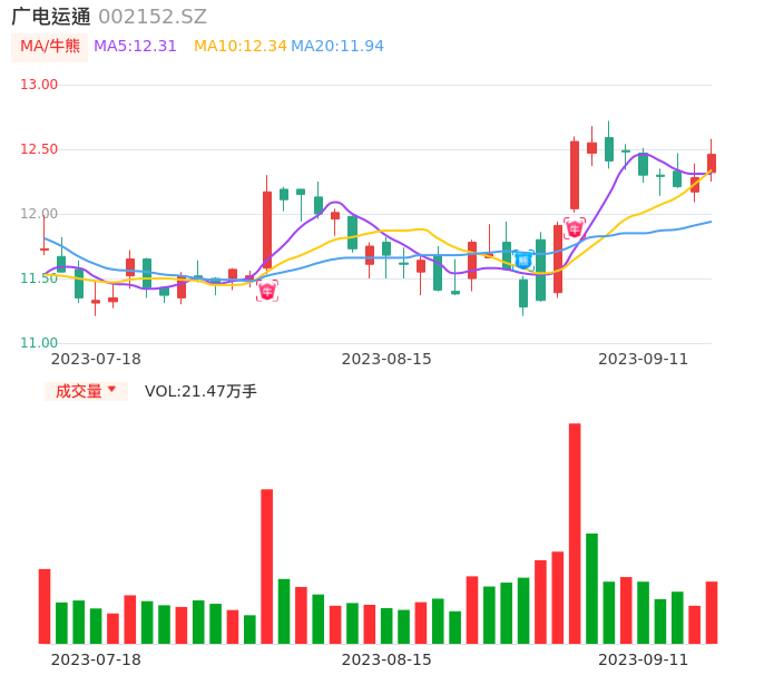 09月11日,广电运通收报12.46,股价涨幅1.47%,成交金额2.66亿元,换手率0.87%。