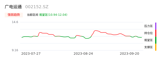 我们来看一下该股的九方特色指标强弱趋势的情况:广电运通自09月15日从持仓区下穿到观望区,股价近期持续走弱。短期已经进入空头行情,且下跌动能仍未衰竭。建议继续谨慎观望。