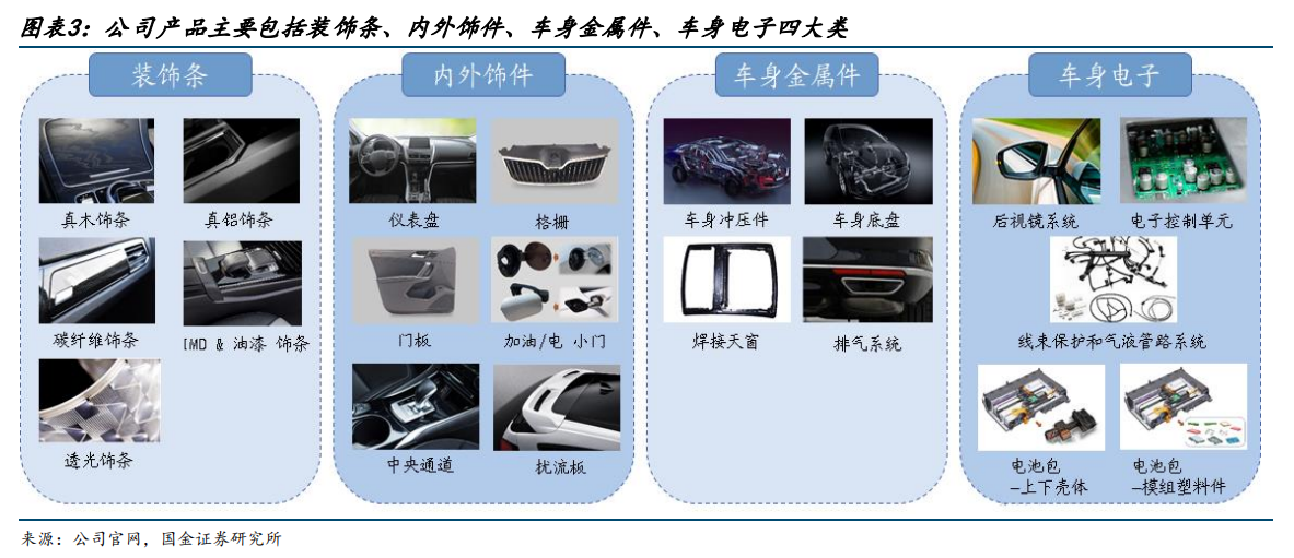 公司专注于中高档乘用车零部件的设计、研发、生产、销售及售后服务,为众多国际知名汽车品牌提供内外饰件、车身金属件及汽车电子产品等全方位解决方案,曾荣获“国家高新技术企业”奖和“汽车零部件供应链优秀企业”奖,是全球汽车行业优秀供应商代表之一。