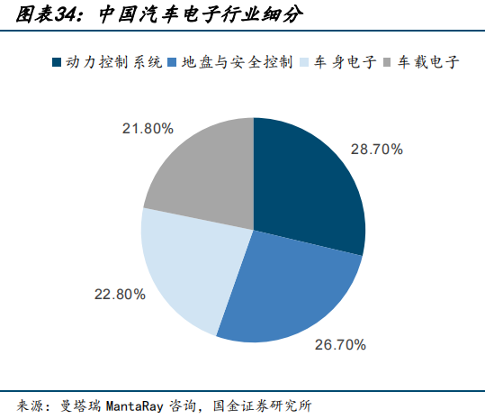 在汽车电子技术链条中占据核心地位;地盘与安全控制占比26.70%,车身电子、车载电子分别占22.80%和21.80%,四大板块占比相对均衡。
