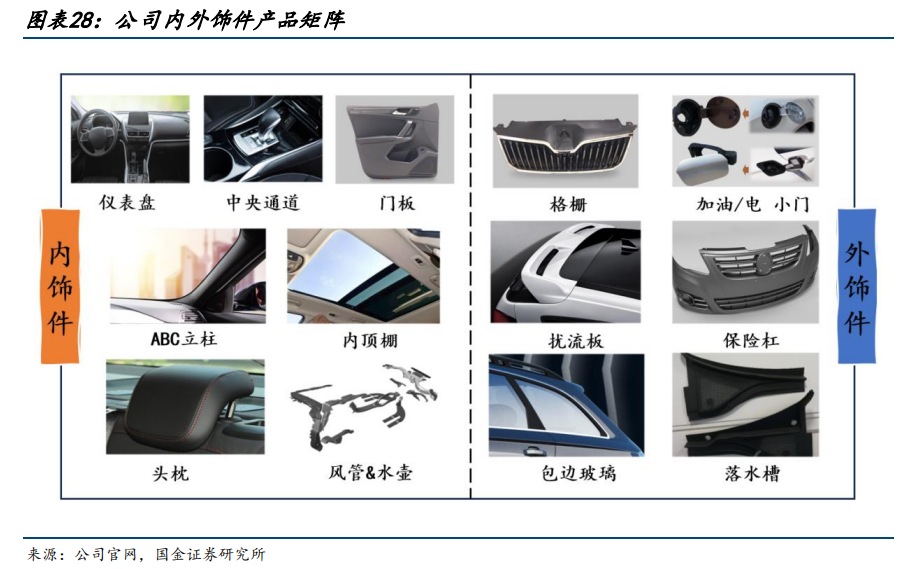 公司在内外饰件领域具有卓越的质量与广泛覆盖的产品矩阵。内饰件方面,公司精心打造仪表盘、中央通道、门板、ABC立柱、内顶棚、头枕及风管&水壶,每一款产品均源自公司精细设计,在舒适性、功能性及耐用性上全方位满足了内饰空间的品质需求。