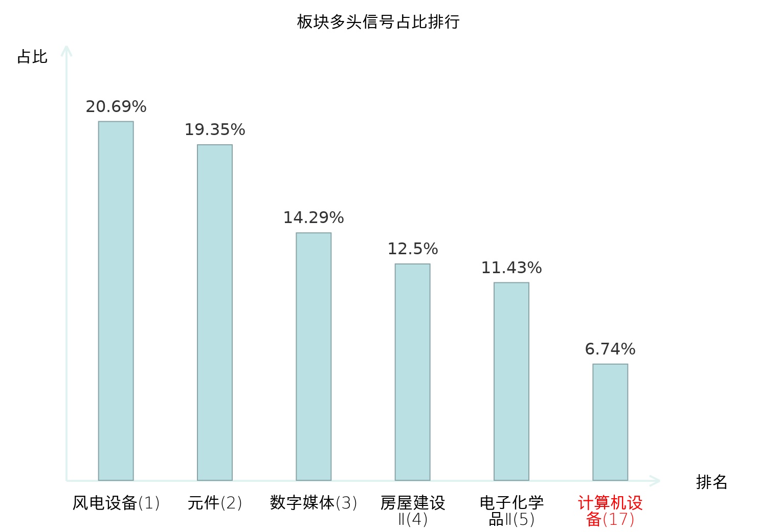 全市场所有行业板块中主力多头信号占比排名中,风电设备板块位居第一。房屋建设Ⅱ板块名次提升最快,较昨日上升116位。