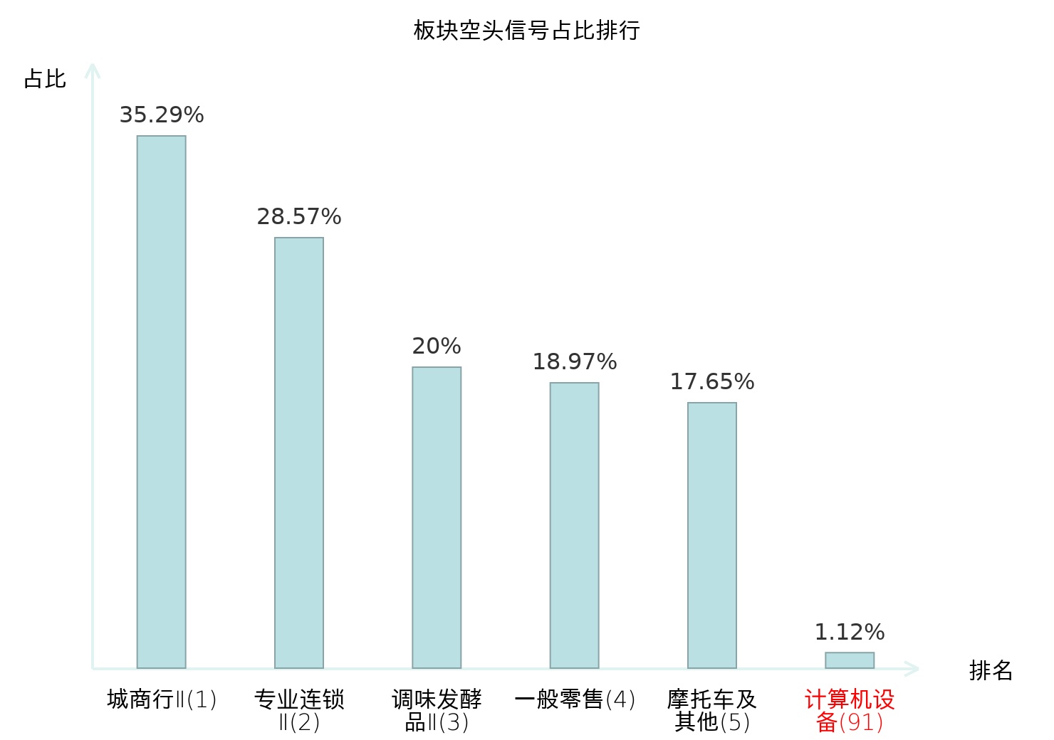 全市场所有行业板块中主力空头信号占比排名中,城商行Ⅱ板块位居第一。炼化及贸易板块名次提升最快,较昨日上升96位。