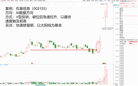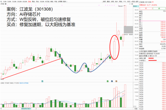 注意江波龙的形态分布,破位后走出反复筑底形态,然后股价缓慢修复至前高附近,最后走出倍量大阳线,确定主力意图,此时买点确立。