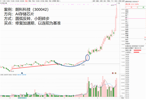近期,朗科科技因AI存储芯片的炒作而大涨,从黄金坑的角度理解,年初以来该股就处于形态构建中。先是下跌破位,然后构筑圆弧底,反弹初期以碎步连阳的结构,恢复上行趋势,临突破时,以倍量大阳线的方式,确立强度,此大阳线足以表明主力坐庄迹象,也是我们的买点。