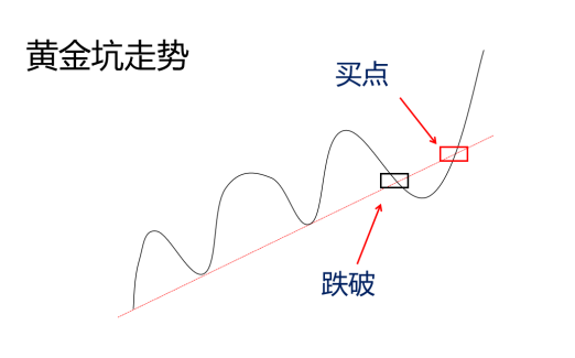 “黄金坑”,也有人把它叫做炸弹坑,就是个股上涨趋势中,借助大盘回调或市场其它利空因素进行一次快速的下跌,并跌破上涨趋势线。