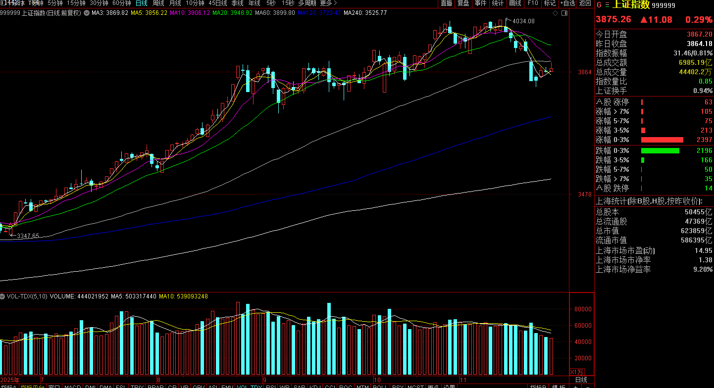 三大指数冲高回落,其中沪指涨0.29%,深成指跌0.25%,创业板指跌0.44%。总体个股涨多跌少,上涨家数为2790家,涨停家数(排除ST)为53家,跌停家数(排除ST)为8家,市场情绪延续分化。两市成交额总计1.71万亿,较昨日缩量736亿,成交量小幅缩减