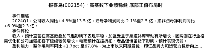 值得注意的是:2024年05月长江证券的于旭辉/陈佳/魏杏梓分析师,首次发布关于报喜鸟的研究报告,标题为:报喜鸟(002154):高基数下业绩稳健 底部正值布局时。
