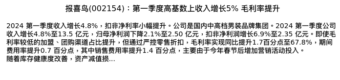 值得注意的是:2024年04月国信证券的丁诗洁/关竣尹分析师,首次发布关于报喜鸟的研究报告,标题为:报喜鸟(002154):第一季度高基数上收入增长5% 毛利率提升。