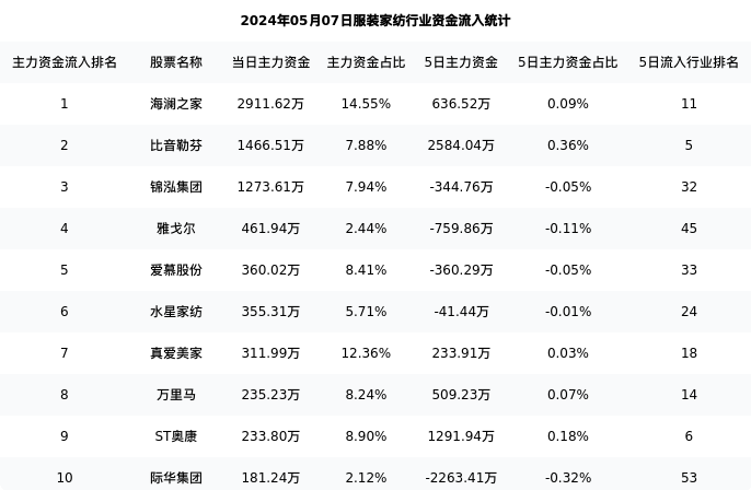 从主力资金流向来看,服装家纺行业今日主力资金流入7.89亿元,在所有申万二级行业中排名:60/131。