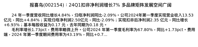 值得注意的是:2024年05月长城证券的黄淑妍分析师,首次发布关于报喜鸟的研究报告,标题为:报喜鸟(002154):24Q1扣非净利润增长7% 多品牌矩阵发展空间广阔。
