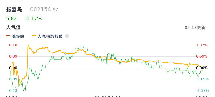 05月13日,报喜鸟收报5.82,股价涨幅-0.17%,成交金额1.36亿元,换手率1.98%。