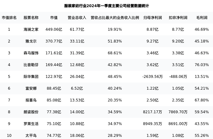 报喜鸟最新报告期数据为一季度,下表汇总了服装家纺行业内市值靠前的公司一季度主要经营数据
